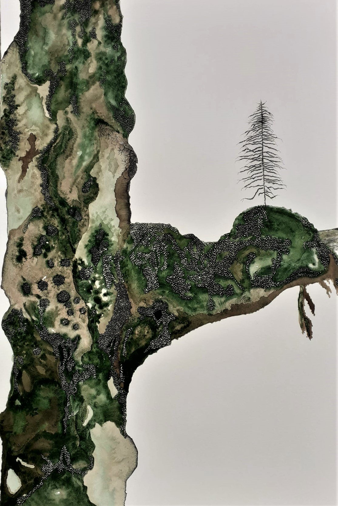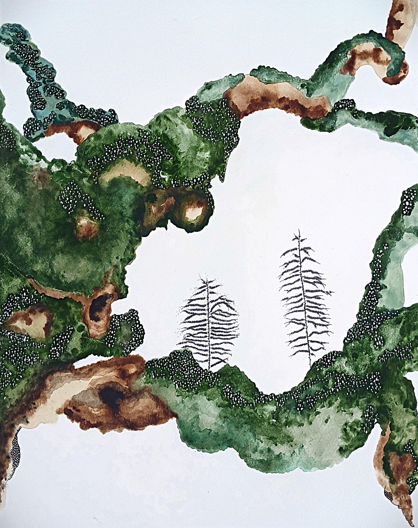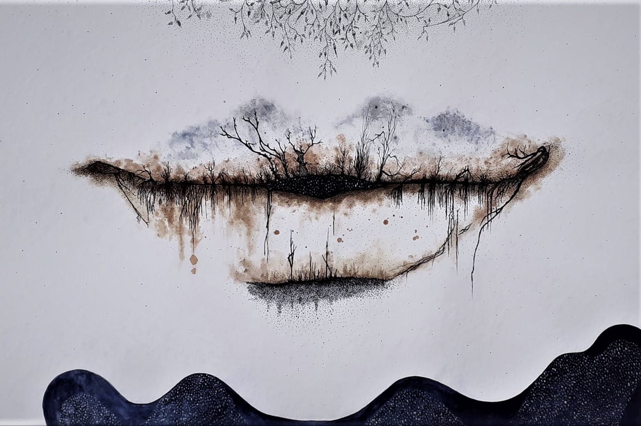 La couleur prend petit à petit sa place en 2020 lors des premiers confinements. Plus question de rester dans un bocal, les encres sont un échappatoire et s’inscrivent dans un élan de vie. Le doute accompagne cette nouvelle série, avec toujours ce vacillement entre l’être et le végétal… je cherche.