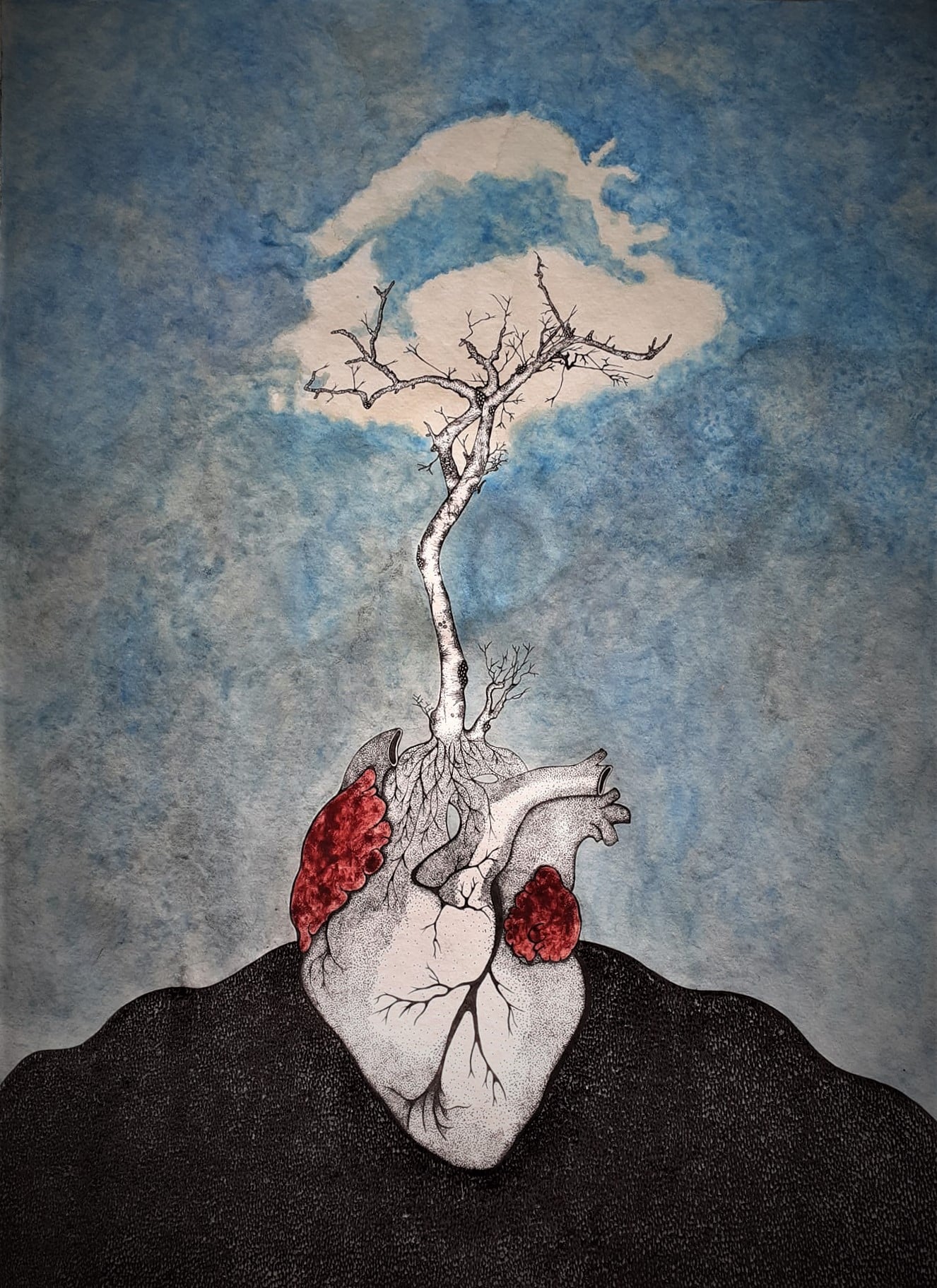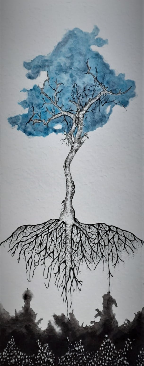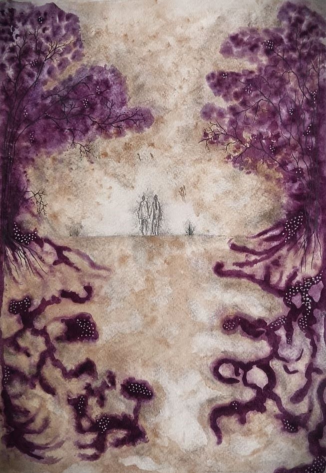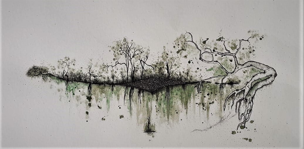 La couleur prend petit à petit sa place en 2020 lors des premiers confinements. Plus question de rester dans un bocal, les encres sont un échappatoire et s’inscrivent dans un élan de vie. Le doute accompagne cette nouvelle série, avec toujours ce vacillement entre l’être et le végétal… je cherche.